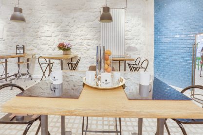 L’un de nos espaces bénéficie d’une double vitrine lumineuse et d’une surface de vente confortable. L’intérieur, qui mise sur le contraste entre des pierres apparentes et des luminaires contemporains, est décoré dans des tons clairs et chaleureux.